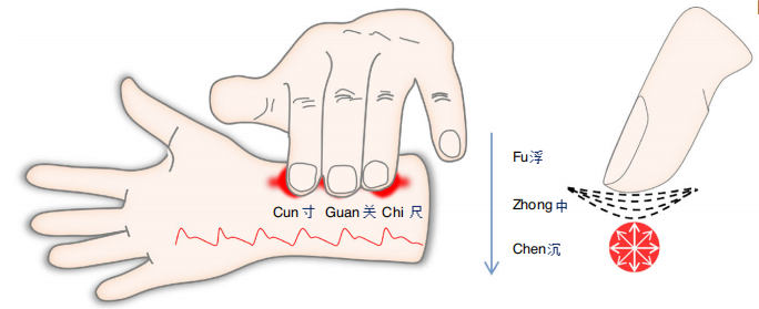 中医诊脉有其独特的手法,主要包括“寸、关、尺”三个取脉部位和“浮、中、沉”三种取脉力度。