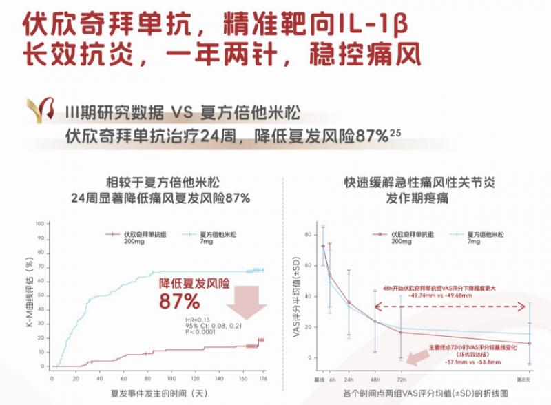 持久保护:这是伏欣奇拜单抗最革命性的优势。它一年仅需注射两次(每半年一次)。关键的三期临床试验数据表明,对于痛风发作的患者,单次注射伏欣奇拜单抗后,能在24周(约6个月)内,将痛风急性发作的风险显著降低87%。这意味着,它为降尿酸最艰难、最容易复发的初期阶段,提供了一个强大的“保护窗口”,极大提升了患者坚持降尿酸治疗的信心和成功率。